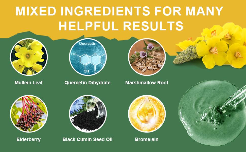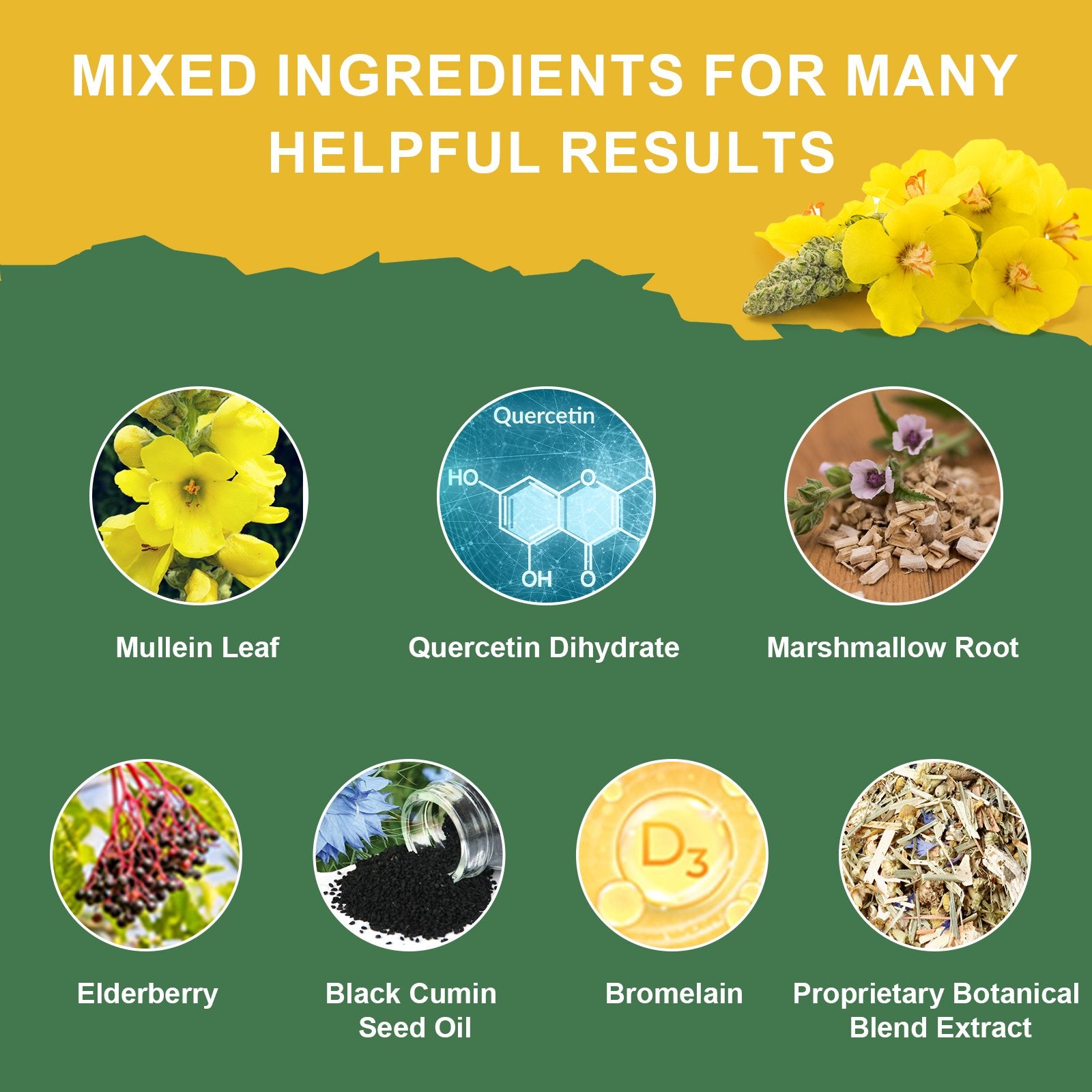 - 1000mg Mullein Leaf Extract & More Helpful Ingredients - 1000mg Mullein Leaf extract combines with 250mg quercetin cihydrate, 100mg marshmallow root, 100mg elderberry, 100mg black cumin seed oil, 50mg bromelain & 200mg proprietary botanical blend extract. Jointly helps the immune system, respiratory health, digestive function, lung cleanse, energy & vitality.