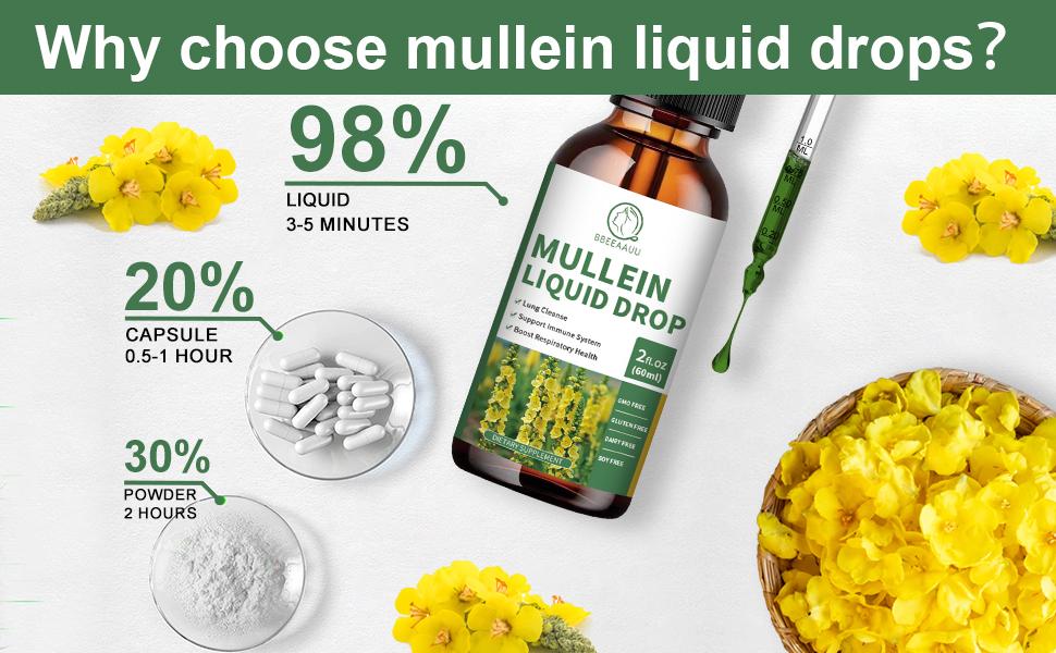 - Easy to Take & Absorb - BBEEAAUU mullein drops for lungs are easy to take. Take it directly into your mouth or add it to water or juice. Liquid drop is the best form to be absorbed by our body. Approx.: Liquid will be absorbed 98% in 3-5 minutes, Capsules: 20% in 0.5-1 hour, and Powder: 30% in 2 hours.